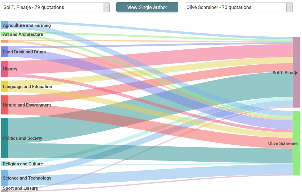 The dictionary documents words as used by writers, explorers and other historical figures. Create charts that show how frequently-cited authors intersect or diverge across the lexicon's subject domains; data points previously overlooked as unrelated text are now aggregated and collated graphically.